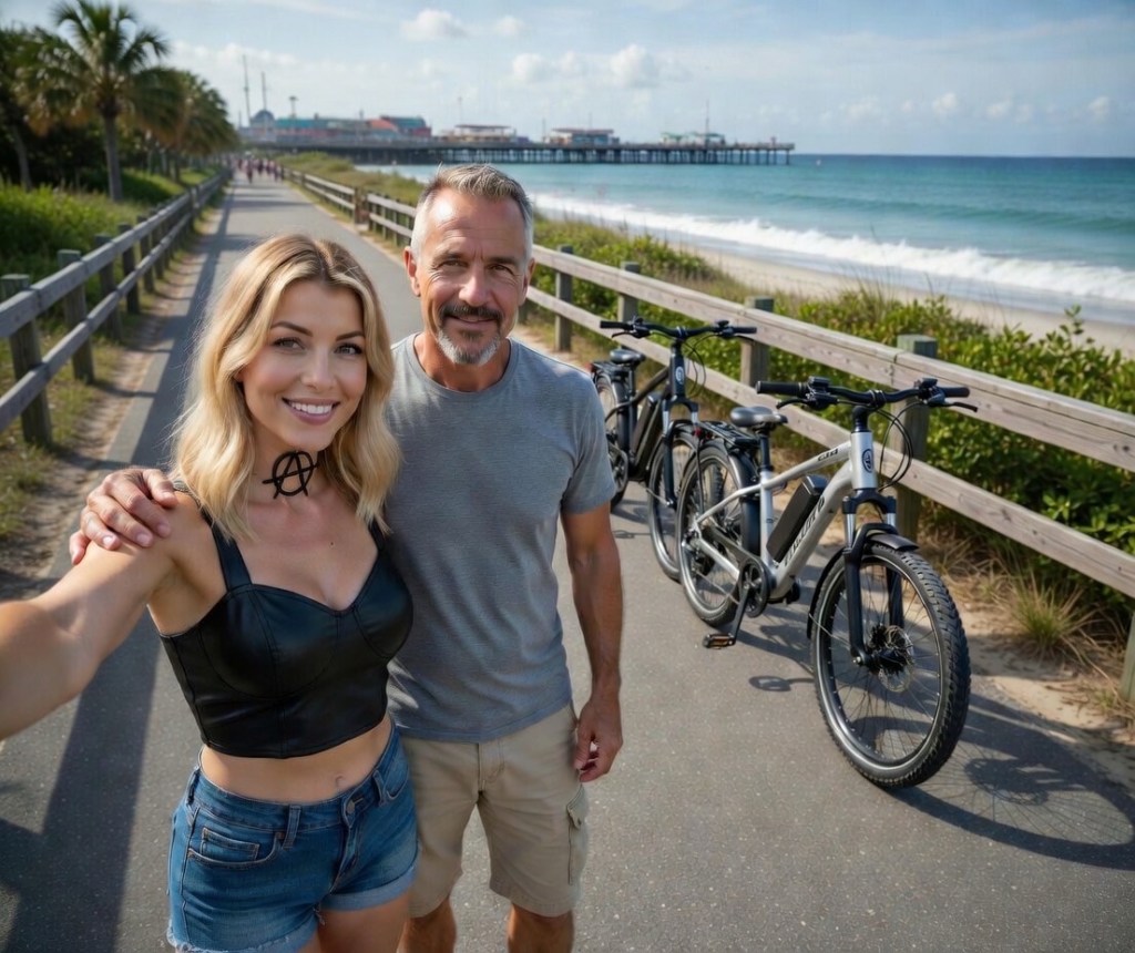We hopped on the e-bikes this morning, me in my tiny black shorts and tight tube top that make my husband stare, him looking like the hottest captain on two wheels.